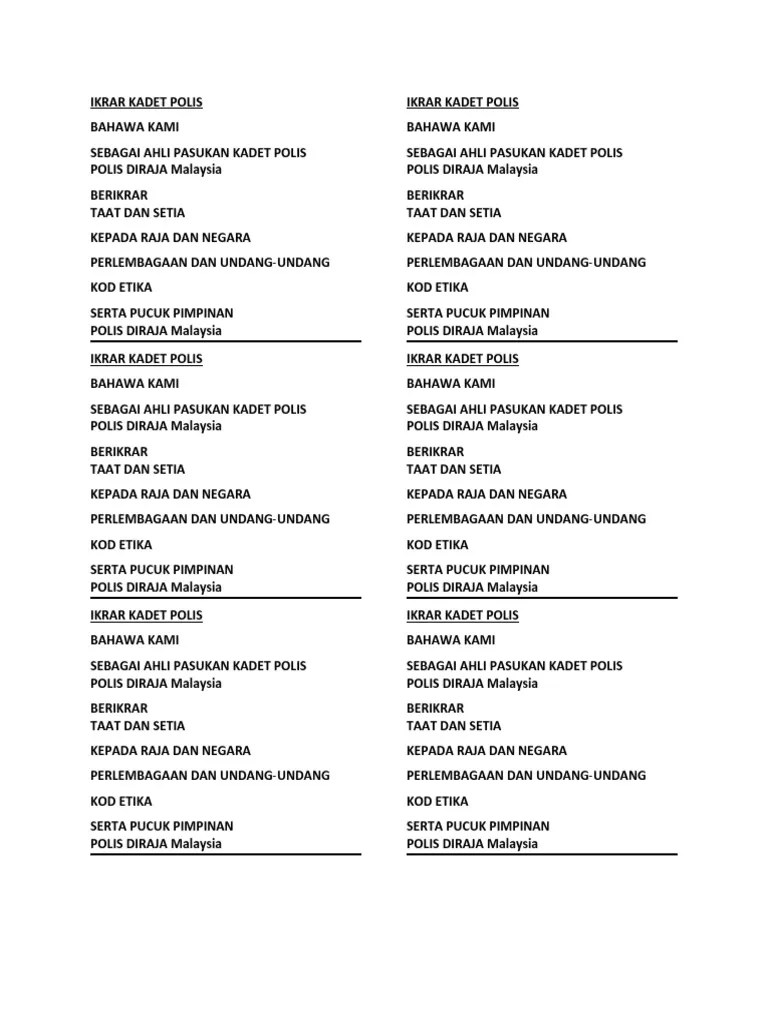 Tegas, adil dan berhemah citra pasukan bermaruah setia sepakat mengatur langkah pertahan bumi bertuah di. Berkibar sang saka biru gagah sentiasa. Lirik lagu kor kadet polis lirik lagu kor kadet polis polis sedia berkhidmat polis sedia berkhidmat kerna negeri dan rakyat hidup berbahagia aman sentosa . Lirik lagu kor kadet polis. Sebagai ahli kadet polis, kita sepatutnya tahu akan lirik lagu kita dan menghafalnya. Bersatu bergerak maju berkhidmat kepada semua pasukan kadet polis diraja . Pusaka polis di raja inilah azimat kita. Lirik lagu ' polis sedia berkhidmat polis sedia berkhidmat kerna negeri dan. Lirik lagu rasmi kadet polis. Lirik lagu sang saka biru : Tegas, adil dan berhemah : 8172019 lirik lagu rasmi kadet polis 11 lirik lagu rasmi kadet polis polis sedia berkhidmat polis sedia berkhidmat kerna negeri dan rakyat hidup berbahagia . Play this game to review education. ,tegas menegakkan keadilan,hingga__________ pilihkan jawapan yang betul untuk lirik lagu .